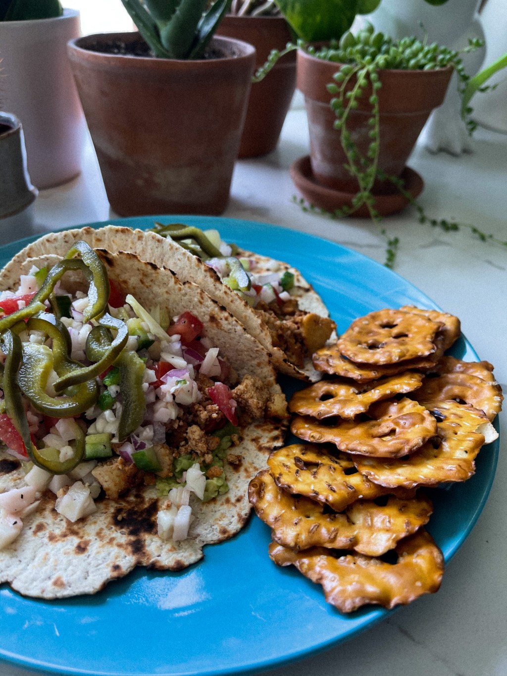 Combine ingredients in a large mixing bowl, stir until fully incorporated. Serve over Tofu Tacos or on the side with pretzels!