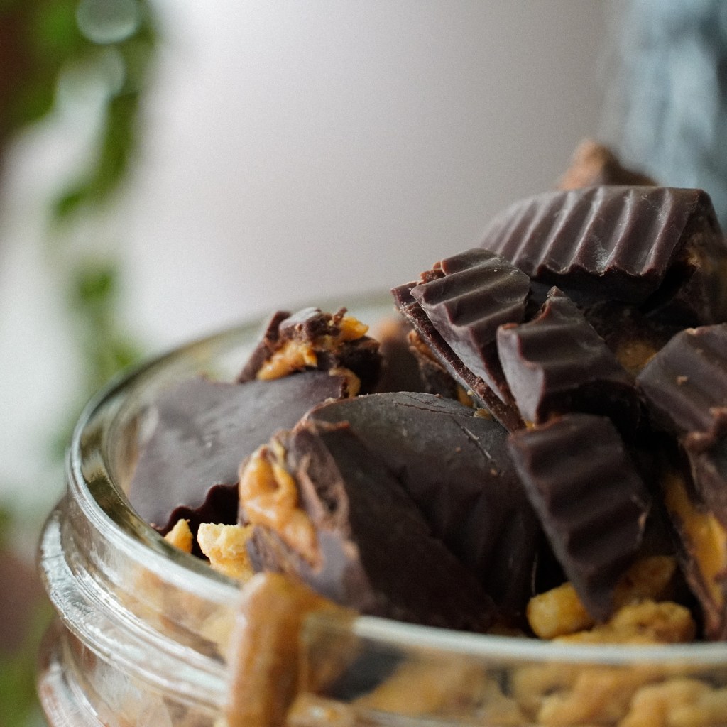 Combine rolled oats, chia seeds, cocoa powder, oatmilk yogurt, almond butter, chocolate chips, almond milk and pancake syrup in a Mason Jar or Tupperware of choice. Stir until fully incorporated. Refrigerate for 4-6 hours or overnight. Top with smashed dark chocolate peanut butter cups for a delightful morning treat!