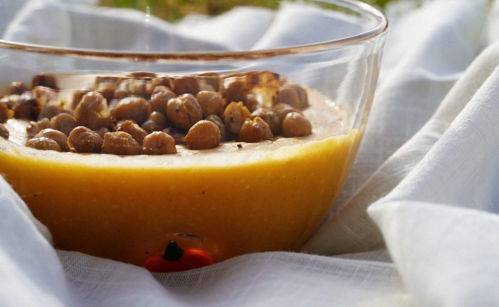 In a large saucepan over medium heat saute onion, garlic, and chili of choice until soft and fragrant. Add the roasted peppers, chickpeas, cumin seeds and salt/pepper to taste. Cook for an additional 10 minutes. Transfer ingredients to blender, blend. Add vegetable stock, blend. Slowly add lemon juice and zest until desired potency. Finally add the rice and blend well! Garnish with roasted chickpeas and serve hot!